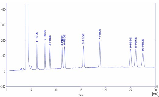 盟议会和理事会于2003年1月通过了RoHS指令,全称是The Restriction of the use of certain Hazardous substances in Electnical and Electronic Equipment,即在电子电气设备中限制使用某些有害物质指令,也称2002/95/EC指令,2005年欧盟又以2005/618/EC决议的形式对2002/95/EC进行了补充,明确了六种有害物质的最大限量值,这六种物质分别为:铅Pb、镉Cd、汞Hg、六价铬Cr6+、,多溴联苯醚PBDE,多溴联苯PBB。世界各国尤其是发达国家,对RoHS指令的出台反响强烈,高度关注;中国是全球制造业大国,也是产品出口大国,出口总量的70%以上涉及到RoHS指令,因此中国政府亦十分重视相关问题,并于2004年出台了《电子信息产品污染防治管理办法》,内容类似RoHS指令,并准备与其同步实施。作为该指令中的多溴联苯醚类有害物质----溴化阻燃剂,被广泛用于多种消费品中,包括电子产品、纺织品、家具、日化、玩具等,这些物质的存在,一方面避免产品起燃,确保人类生活安全,然而另一方面,由于该类物质在生产和回收中多有残留,也已影响到人类的生活健康,这也是该指令颁布的初衷。针对该指令中多溴联苯醚溴系阻燃剂的测定,国家公认的检测方法有GC/MS、GC/FID、GC/ECD、HPLC/MS/MS、 HPLC/UV以及红外光谱法等,然而GC/MS、HPLC/MS/MS仪器价格昂贵,对人员的专业素质要求高,对用户来说,普及率不高,尤其是中小型企业相对难度加大,而GC/FID、GC/ECD、HPLC/UV均只对部分多溴联苯醚进行分离。本文在HPLC/UV的基础上进一步优化,提出了一种方法简便、快速、准确、灵敏度高、适应性好、回收率高,可用于工厂质量控制和检验机构样品检验的方法。