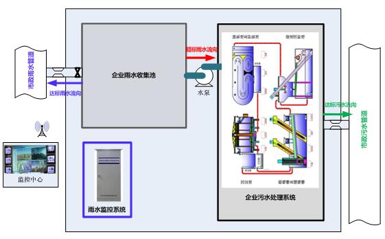 企业雨水通过专用雨水管路汇总到企业雨水收集池,在雨水收集池的总排放口监测雨水流量。