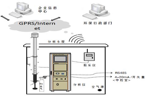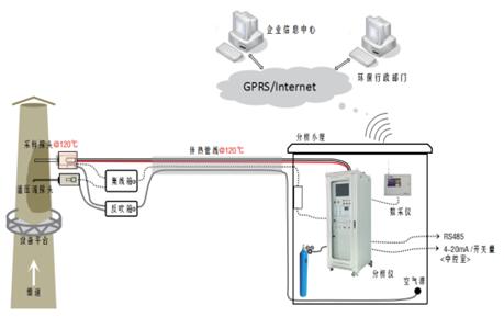 采样探头安装于企业废气排口,排口被测废气被负压抽泵抽取进入采样探头探杆(不加热),经过陶瓷滤芯进入伴热管线(伴热温度可设置),样气在伴热管中继续传输至预处理系统,在预处理系统经过二级过滤和分流后按照一定流量送至在线气相色谱仪(GC-FID)。在线气相色谱仪控制内置自动取样平面十通阀和定量环系统取1mL的被测样气,借助载气送入色谱柱分离和FID做定性、定量分析。分析结果通过工控机保存,并和排气筒监测排放参数一起通过数采仪送至环保监控平台。