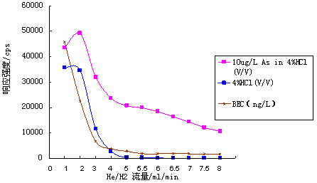 仪器首先在标准模式下进行参数优化(利用10μg·L-1的Li、Co、In、U、Ce调谐液对仪器工作参数进行调节,使仪器灵敏度高,同时氧化物及双电荷产率小于3%);再开启He/H2碰撞反应气,逐步增大He/H2流量,测试超纯水、4%HCl及10μg·L-1 As(4%HCl介质)在75amu处的响应信号,计算其背景等效浓度(详细数据见表1及图1);并利用As标液进一步优化He/H2流量,得到仪器工作参数如表2所示。