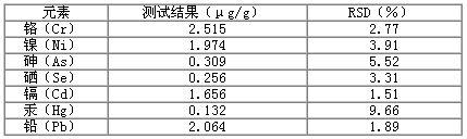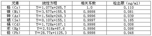 Hg标液单独为一组。Cr 、Ni 、As 、Se 、Cd 和Pb 标液用各元素10μg/mL的标液稀释至所需浓度。配制Hg标液时加入0.1mL 20 μg/mL金标准溶液。分析结果(表2)显示,这7种元素的线性方程的相关系数为0.9996~1.000 ,检出限为0.008~0.165ng/mL。